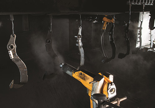 Continuous lines of electrostatic paint, by performing various fully mechanized steps, create an impermeable coating on the parts.